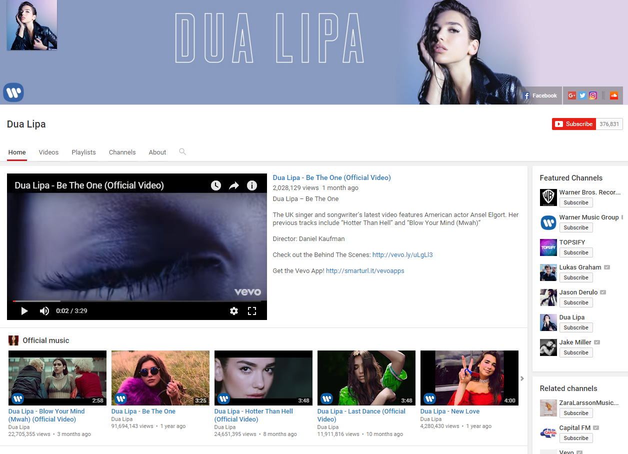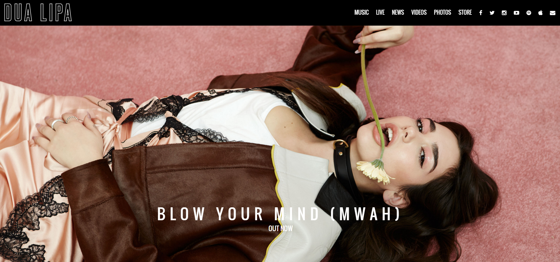 Dua Lipa's website and youtube channel promote her latest single and music video.
