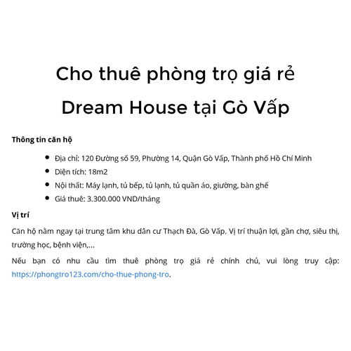 Căn hộ studio tại 120 Đường số 59, Gò Vấp là một lựa chọn phù hợp cho những người đang tìm kiếm một nơi ở giá rẻ, tiện nghi, gần trung tâm thành phố.