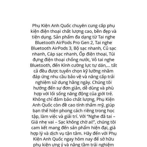 Website: https://phukienanhquoc.com/. Phụ Kiện Anh Quốc chuyên cung cấp phụ kiện điện thoại chất lượng cao, bền đẹp và tiện dụng. Sản phẩm đa dạng từ Tai nghe Bluetooth AirPods Pro Gen 2, Tai nghe Bluetooth AirPods 3, Bộ sạc nhanh, Củ sạc nhanh, Cáp