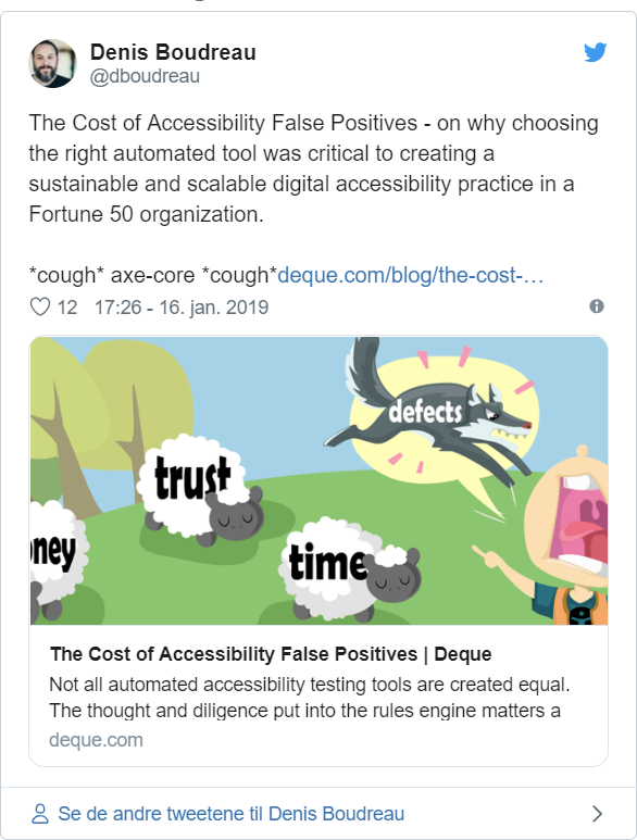 Automatic testing of WCAG undoubtedly contributes to both quality and efficiency, but it often reveals only the tip of the iceberg. I believe human evaluation and user testing are absolutely necessary when we work on creating solutions that can be used by everyone in any situation. The effect of seeing and knowing the problems associated with disability itself should also not be underestimated - Anders Skifte