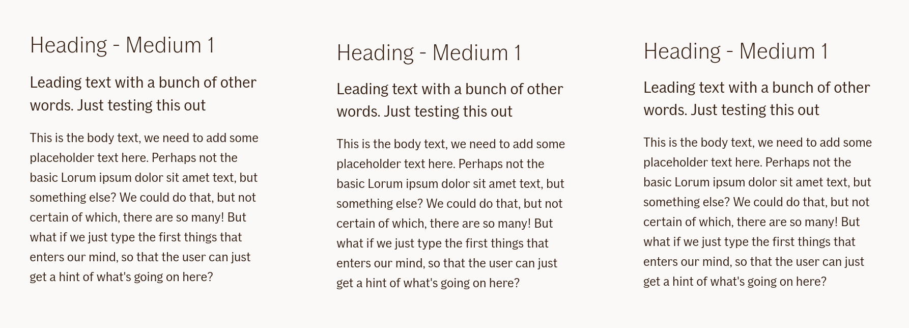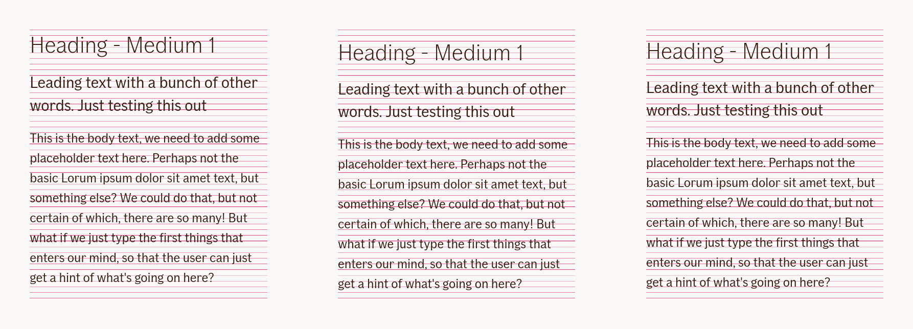 Fra venstre til høyre: 1. Ingenting er gjort 2. med basekick 3. Normalisert, med linjehøyder justert basert på baseline grid (4px/8px)