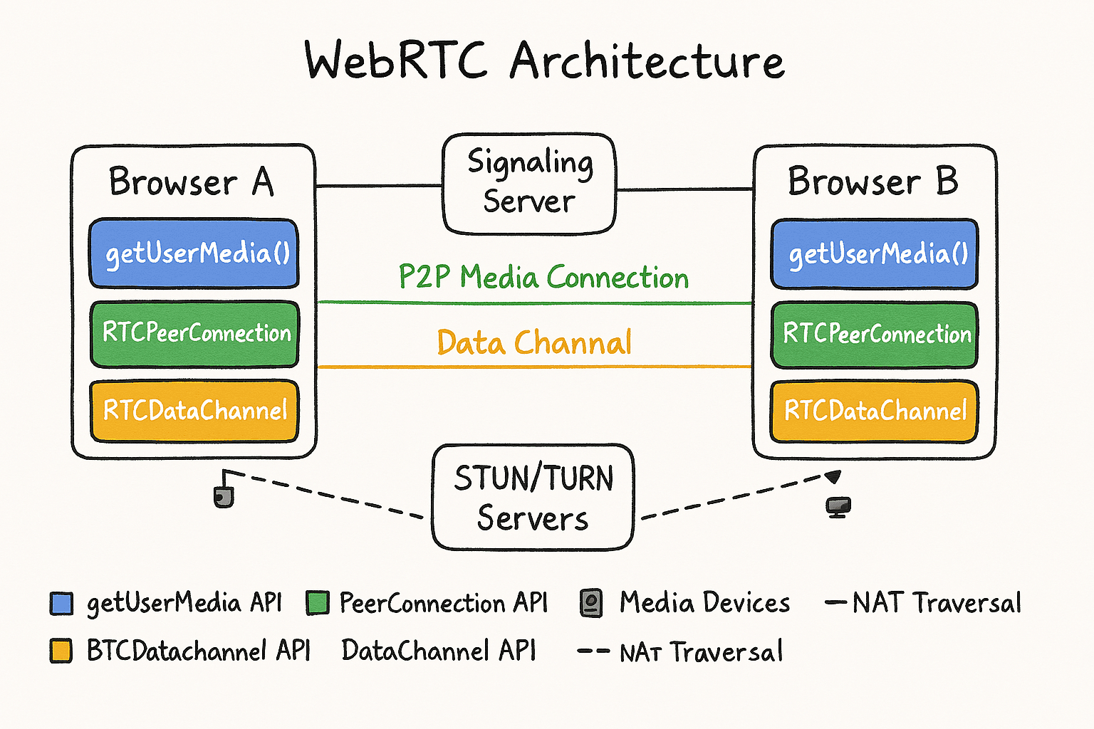 WebRTC enables real-time audio, video, and P2P data channels.