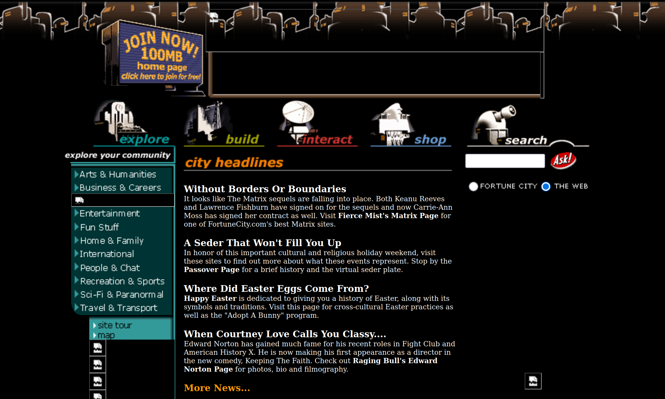 GeoCities launches, letting anyone host personal webpages in themed "neighbourhoods."
