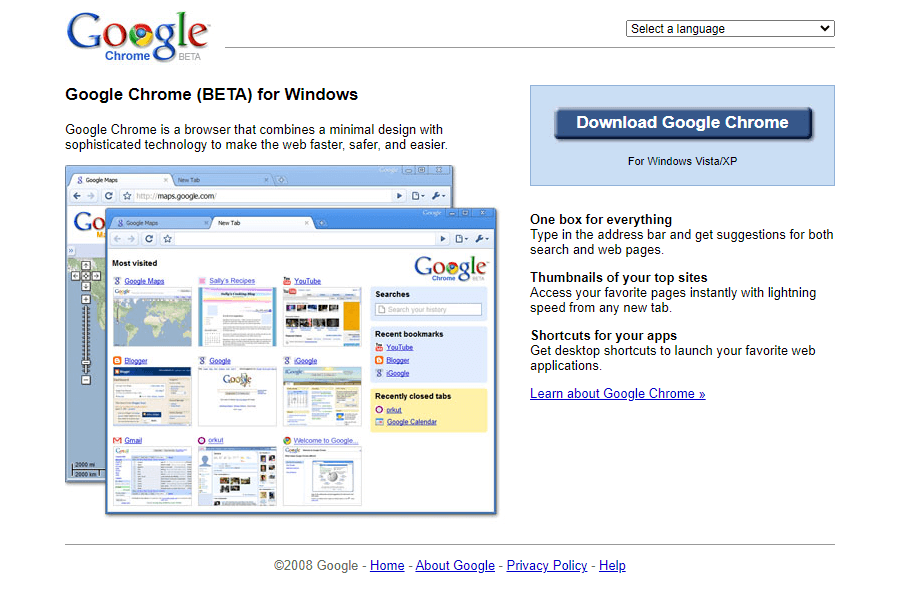 Google Chrome launches with the fast V8 JavaScript engine.