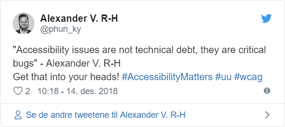 Automatic testing of WCAG undoubtedly contributes to both quality and efficiency, but it often reveals only the tip of the iceberg. I believe human evaluation and user testing are absolutely necessary when we work on creating solutions that can be used by everyone in any situation. The effect of seeing and knowing the problems associated with disability itself should also not be underestimated - Anders Skifte