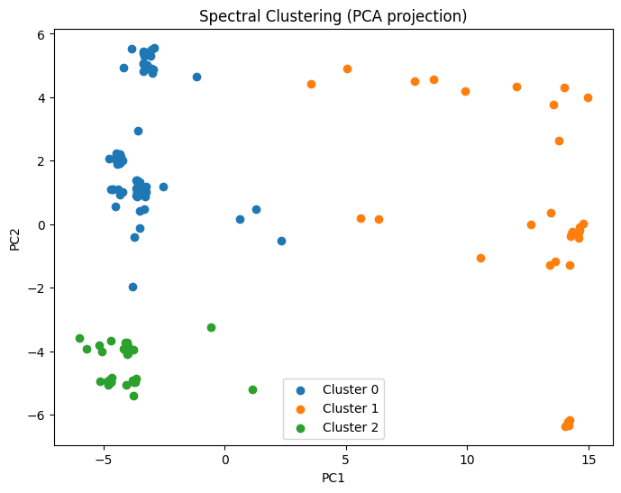 Spectral Clustering builds a similarity graph between the points dividing them in clusters using the eigenvectors of the Laplacian.