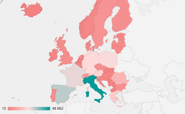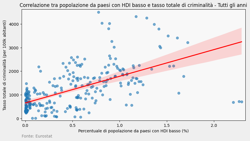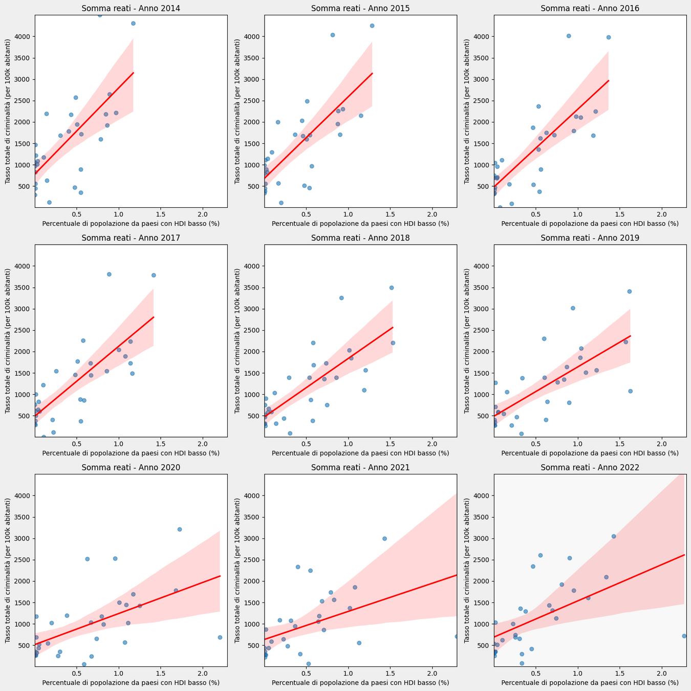 Correlazione tra % di residenti con cittadinanza da paesi a basso HDI e numero di reati