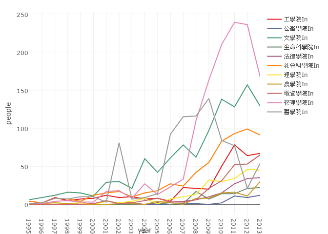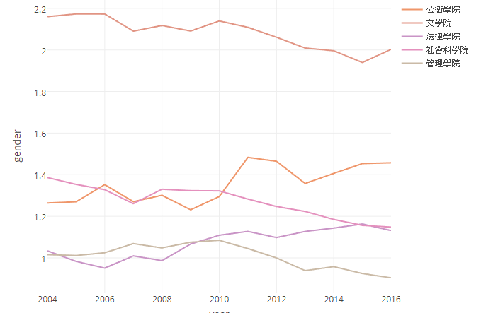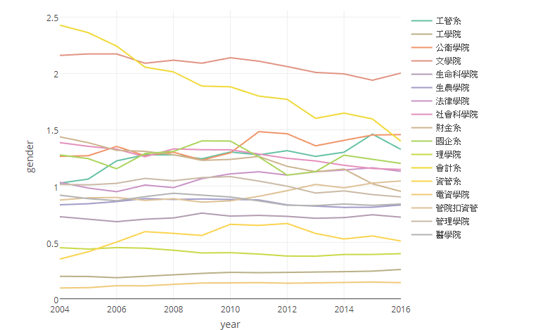 2004-2017 年台大各大院性別比折線圖