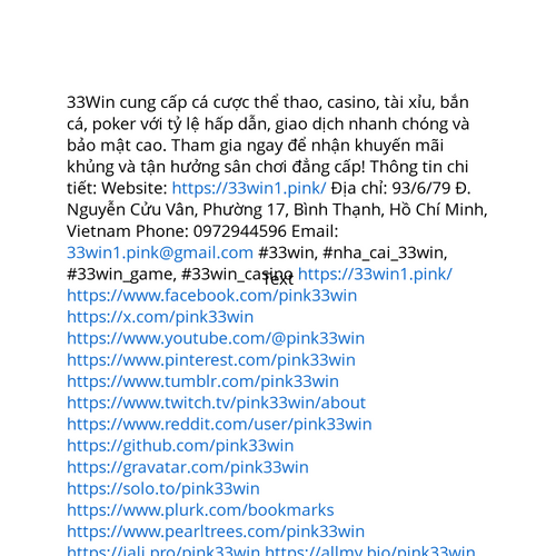 "33Win cung cấp cá cược thể thao, casino, tài xỉu, bắn cá, poker với tỷ lệ hấp dẫn, giao dịch nhanh chóng và bảo mật cao. Tham gia ngay để nhận khuyến mãi khủng và tận hưởng sân chơi đẳng cấp! Thông tin chi tiết: Website: https://33win1.pink/ Địa chỉ: 93/6/79 Đ. Nguyễn Cửu Vân, Phường 17, Bình Thạnh, Hồ Chí Minh, Vietnam Phone: 0972944596 Email: 33win1.pink@gmail.com #33win, #nha_cai_33win, #33win_game, #33win_casino"
