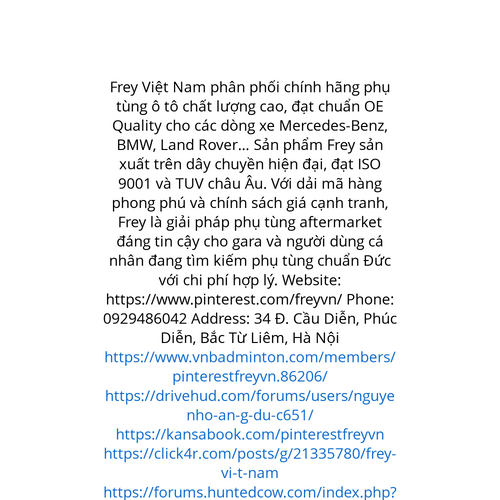 Website: https://www.pinterest.com/freyvn/ Frey Việt Nam phân phối chính hãng phụ tùng ô tô chất lượng cao, đạt chuẩn OE Quality cho các dòng xe Mercedes-Benz, BMW, Land Rover… Sản phẩm Frey sản xuất trên dây chuyền hiện đại, đạt ISO 9001 và TUV châu