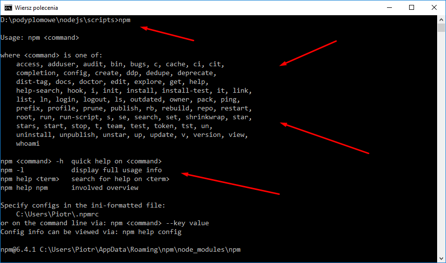 - Npm jest aplikacją wiersza poleceń, za pomocą której można instalować aplikacje dostępne w repozytorium Npm.