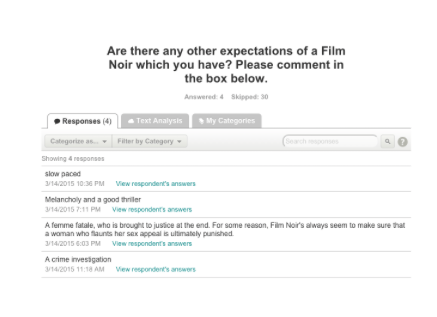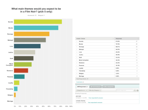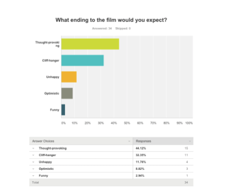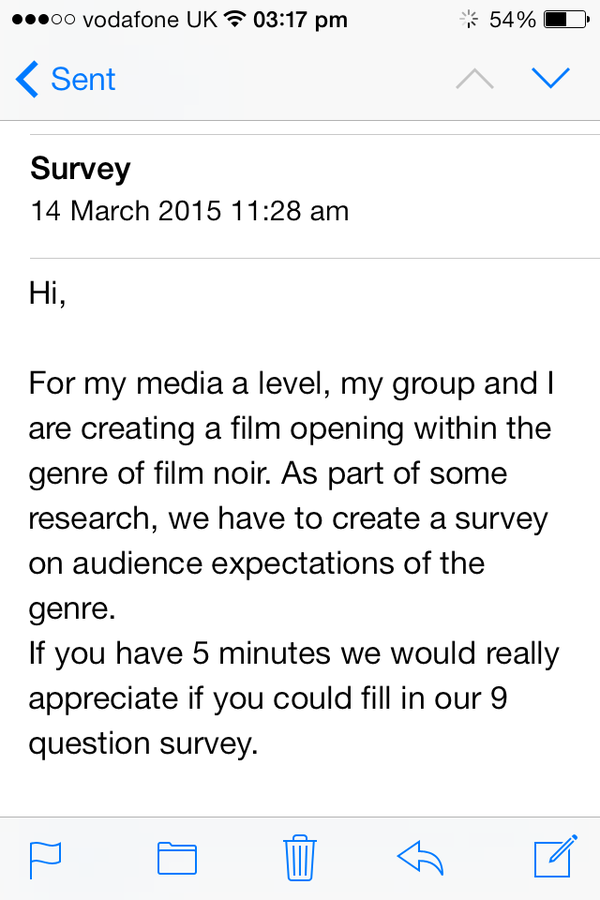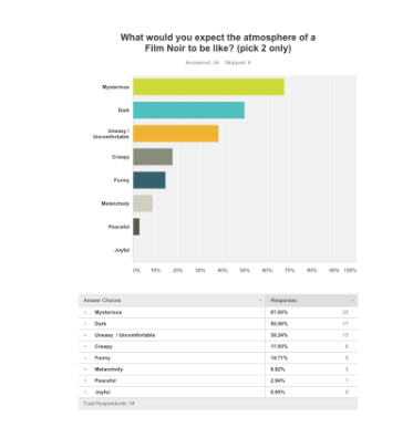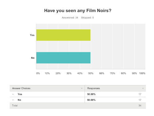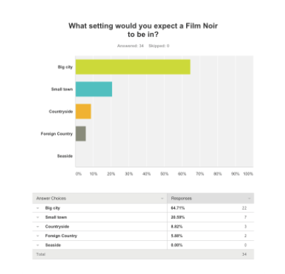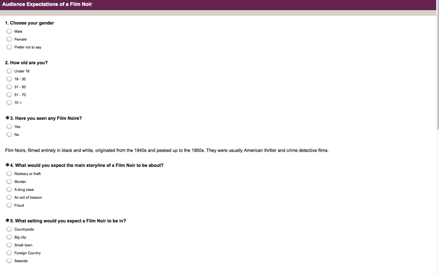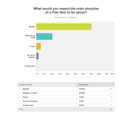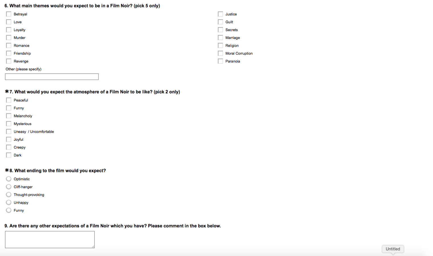 As part of some research for our film, we had to ask a group of people what they would expect to see whilst watching a film noir. Bella decided to present this in the format of a survey monkey; with the aim of reaching more people. Overall, this research will be beneficial to our work, so we can work out what changes we can improve to suit our audiences needs. The 9 question, questionnaire included questions on if people had seen a film noir, and what they would expect the key themes, setting, atmosphere and ending to be.