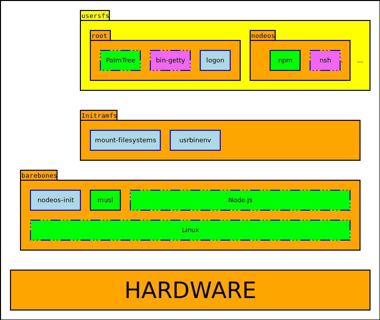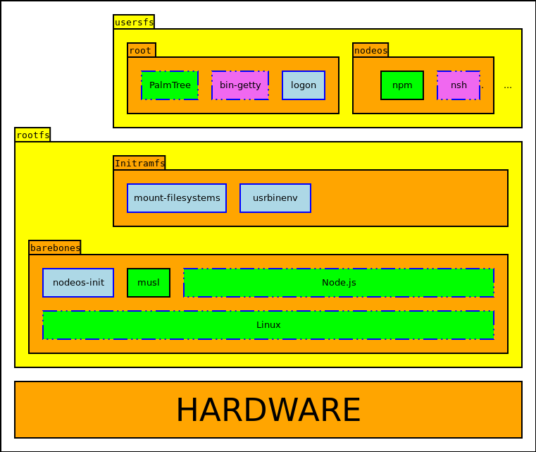 - Generate a read-only boot partition hosting barebonesfs customized Linux kernel and initramfs