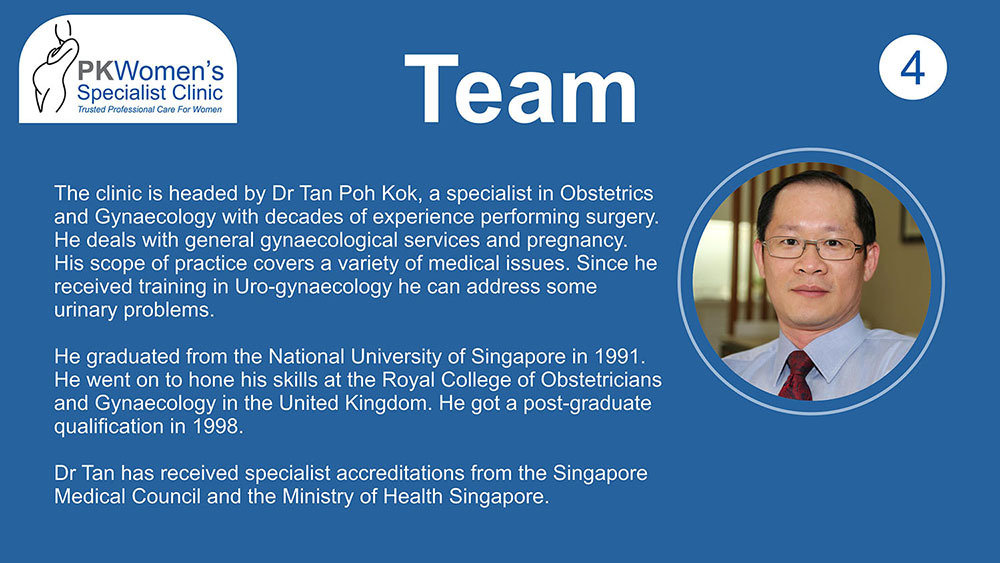 Dr.Tan Poh Kok (PK Tan), is a Senior Consultant Obstetrician and Gynaecologist at PK Women's Specialist Clinic. He is a 1991 graduate of the National University of Singapore; a 1998 Professional graduate of the Royal College of Obstetricians and Gyna