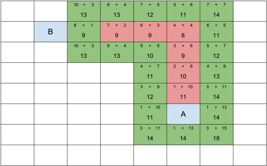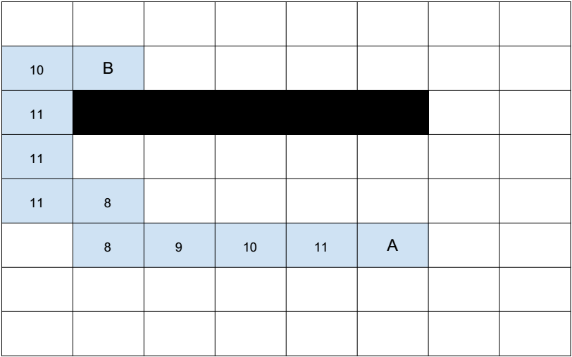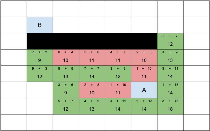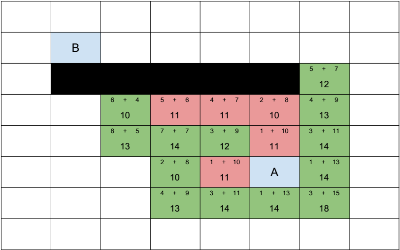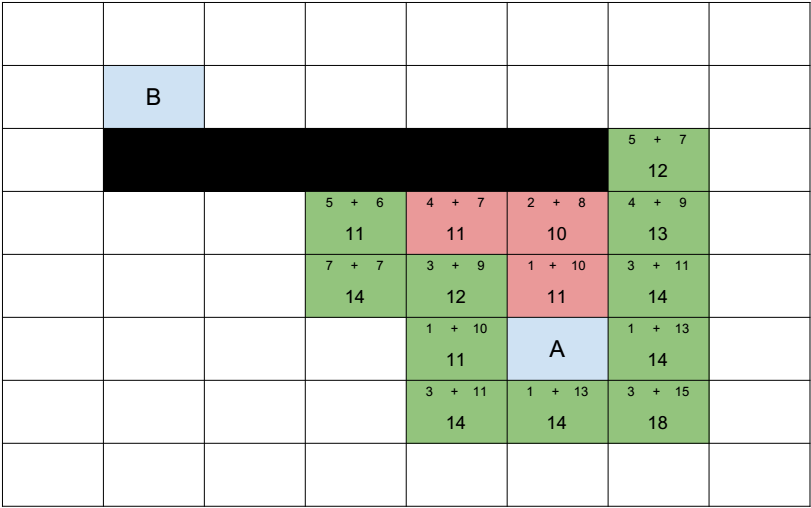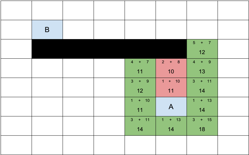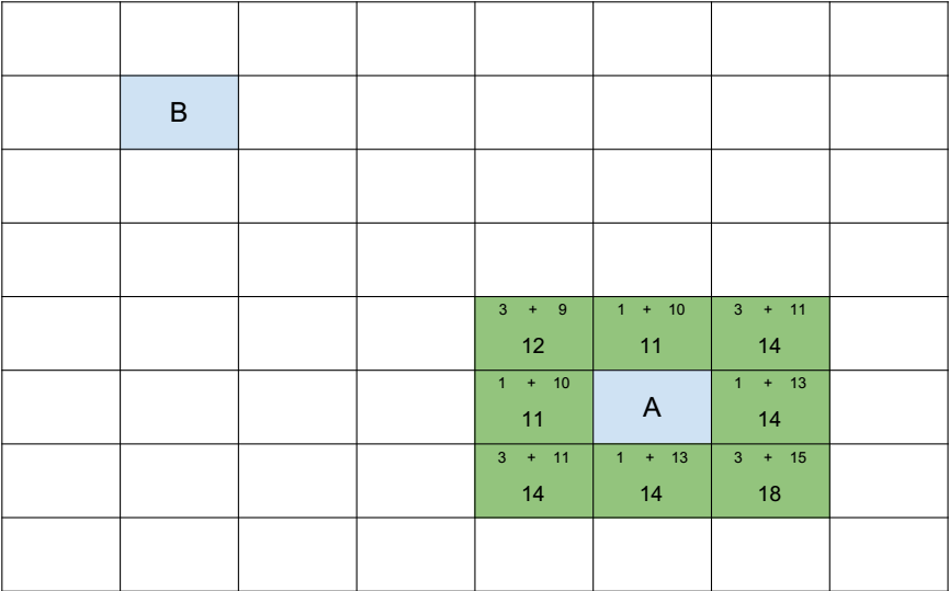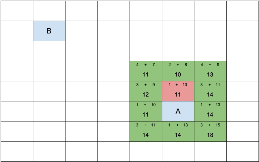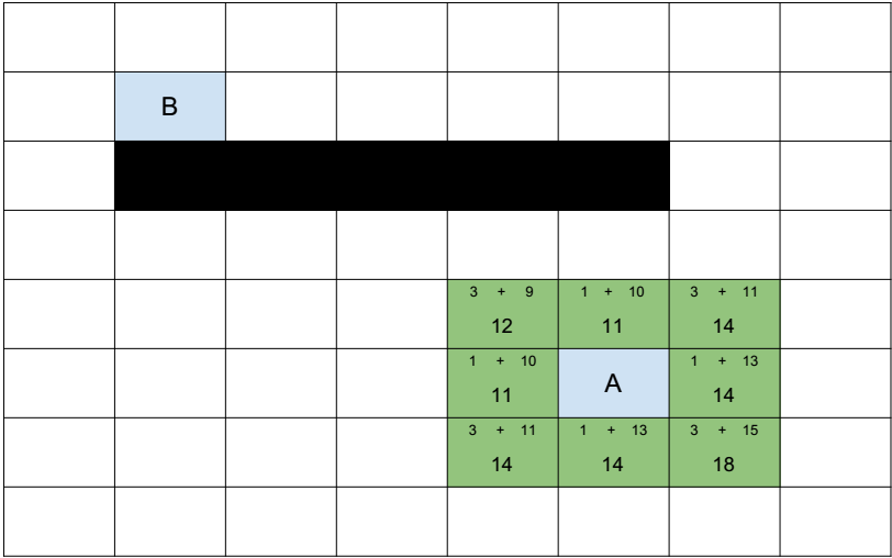 - Sia A il nostro Start e B il nostro Goal. L'algoritmo A* si guarda intorno e sceglie tra le celle adiacenti quale di queste risulta più conveniente;