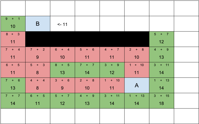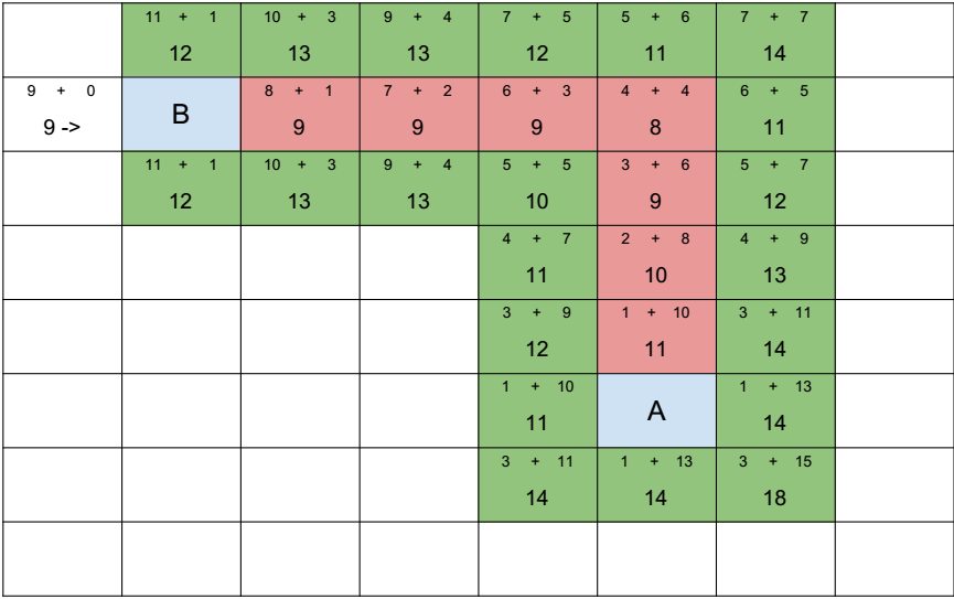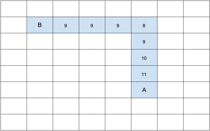 Tra le celle disponibili le più convenienti sono quella di sinistra e quella di sopra. Per evitare che ci siano ambiguità nell'algoritmo, specifichiamo all'algoritmo che preferiamo partire dalle celle in alto.