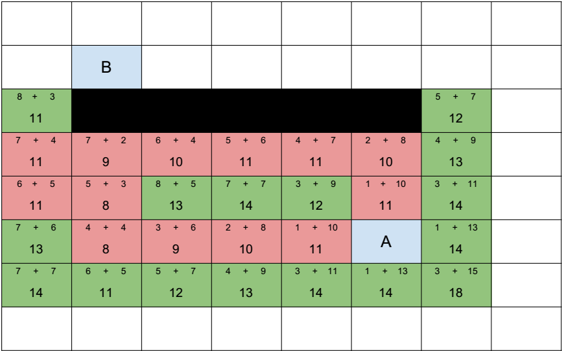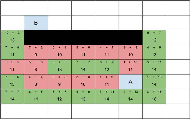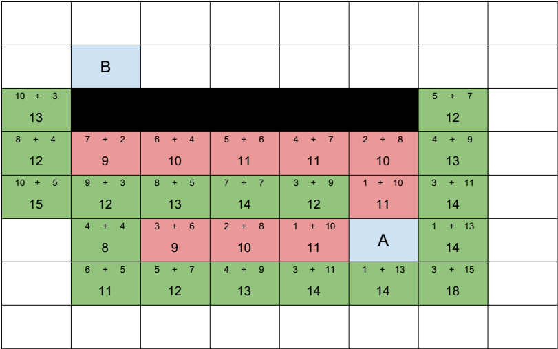 Vediamo adesso un caso in cui c'è un ostacolo. In questo caso l'algoritmo si modifica, avendo a disposizione più cammini con valori simili.