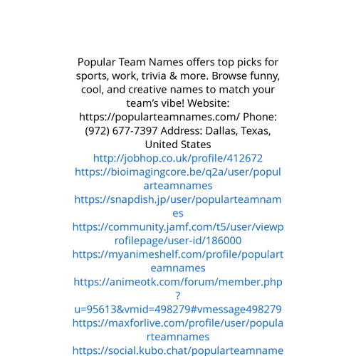 Website: https://popularteamnames.com/ Popular Team Names offers top picks for sports, work, trivia & more. Browse funny, cool, and creative names to match your team’s vibe! Phone: (972) 677-7397 Address: Dallas, Texas, United States