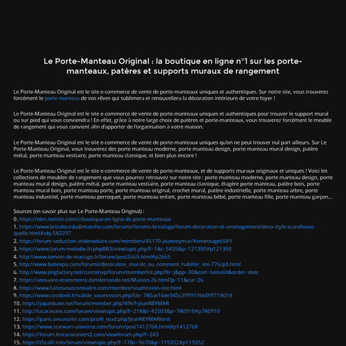 Le Porte-Manteau Original est le site e-commerce de vente de porte-manteaux uniques et authentiques. Sur notre site, vous trouverez forcément le porte manteau de vos rêves qui sublimera et renouvellera la décoration intérieure de votre foyer ! Le Porte-Manteau Original est le site e-commerce de vente de porte-manteaux uniques et authentiques pour trouver le support mural ou sur pied qui vous conviendra ! En effet, grâce à notre large choix de patères et porte-manteaux, vous trouverez forcément le meuble de rangement qui vous convient afin d'apporter de l'organisation à votre maison. Le Porte-Manteau Original est le site e-commerce de vente de porte-manteaux uniques qu'on ne peut trouver nul part ailleurs. Sur Le Porte-Manteau Original, vous trouverez des porte manteau moderne, porte manteau design, porte manteau mural design, patère métal, porte manteau vestiaire, porte manteau classique, et bien plus encore ! Le Porte-Manteau Original est le site e-commerce de vente de porte-manteaux, et de supports muraux originaux et uniques ! Voici les collections de meubles de rangement que vous pourrez retrouvez sur notre site : porte manteau moderne, porte manteau design, porte manteau mural design, patère métal, porte manteau vestiaire, porte manteau classique, étagère porte manteau, patère bois, porte manteau mural bois, porte manteau porte, porte manteau original, crochet mural?