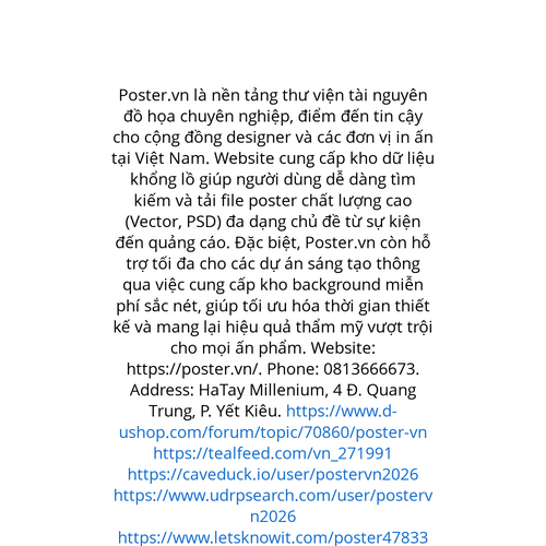 Website: https://poster.vn/. Poster.vn là nền tảng thư viện tài nguyên đồ họa chuyên nghiệp, điểm đến tin cậy cho cộng đồng designer và các đơn vị in ấn tại Việt Nam. Website cung cấp kho dữ liệu khổng lồ giúp người dùng dễ dàng tìm kiếm và tải file