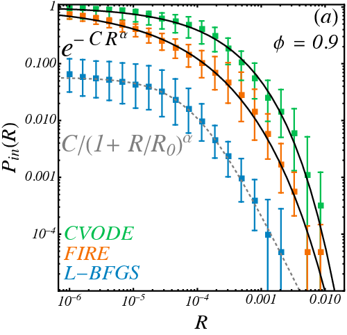 - Half-survival radius \(R_{1/2}(r)\) decays as simple exponential with optimizers (hypercube-like) but as stretched exponential with CVODE implying real basins have "thicker tentacles".