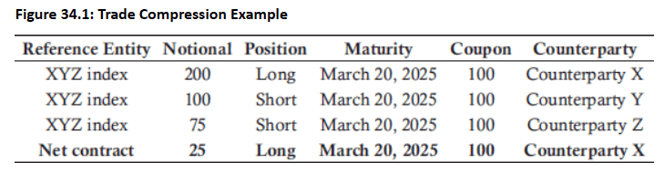 - Example: Three CDS contracts for the same reference entity and maturity with different counterparties can be compressed into one net contract