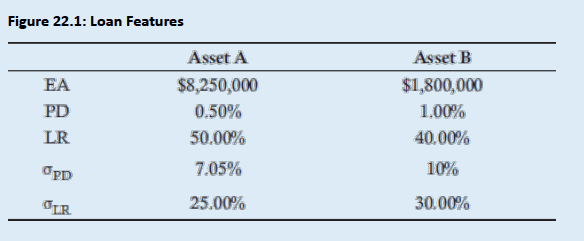 Example: Bigger Bank has two assets outstanding, with their features summarized in below Fig. Assuming a correlation of 0.3 between the assets, compute the expected loss and unexpected losses of the portfolio. Also calculate the risk contribution of each asset.