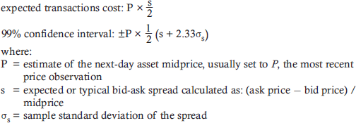 Expected transactions cost and confidence interval: Assuming that daily changes in the bid-ask spread are normally distributed, the expected transactions cost (known as the half-spread) and the 99% confidence interval on the transactions cost in dollars are computed as: