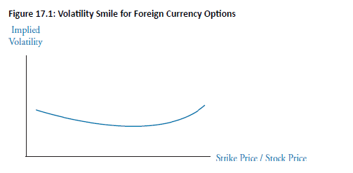 Away-from-the-money currency options have greater implied volatility than at the- money options. This pattern results in a volatility smile.