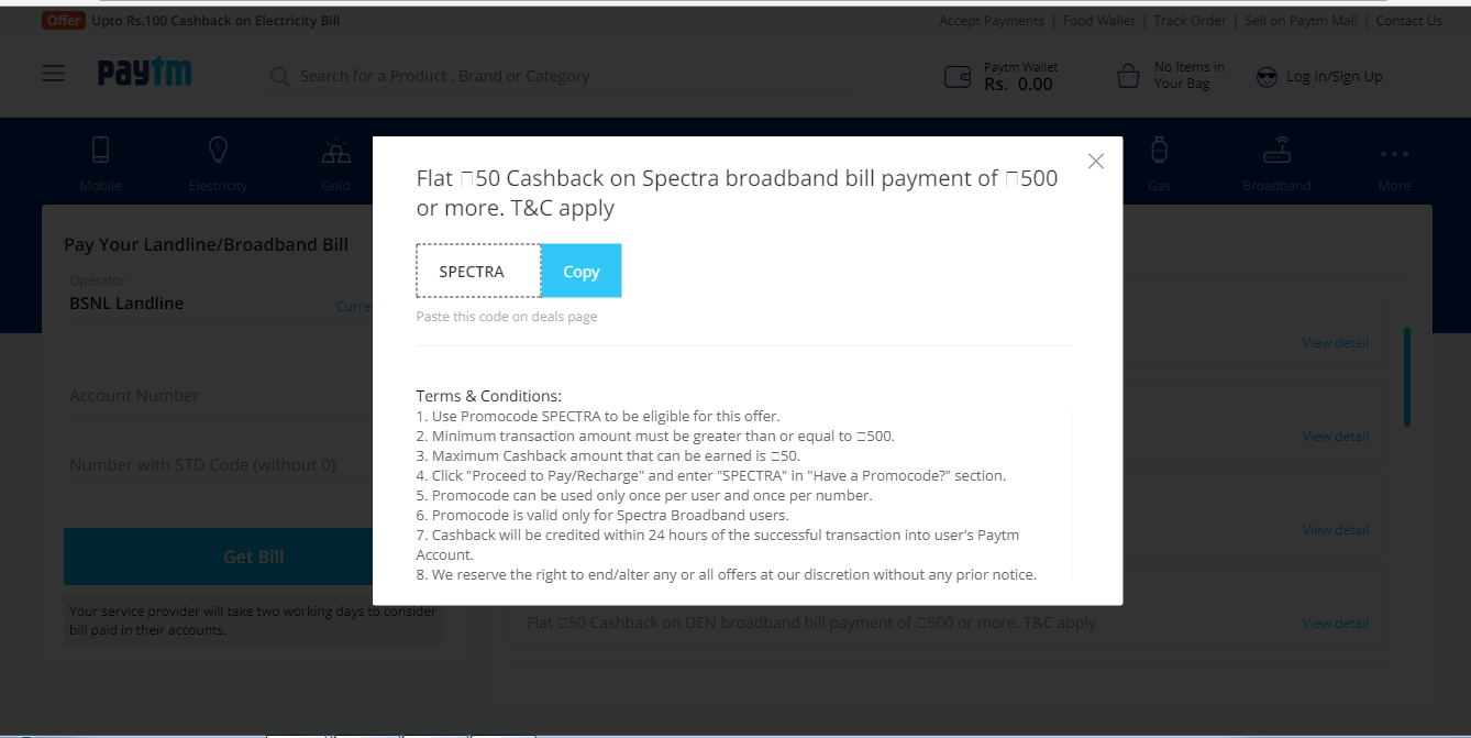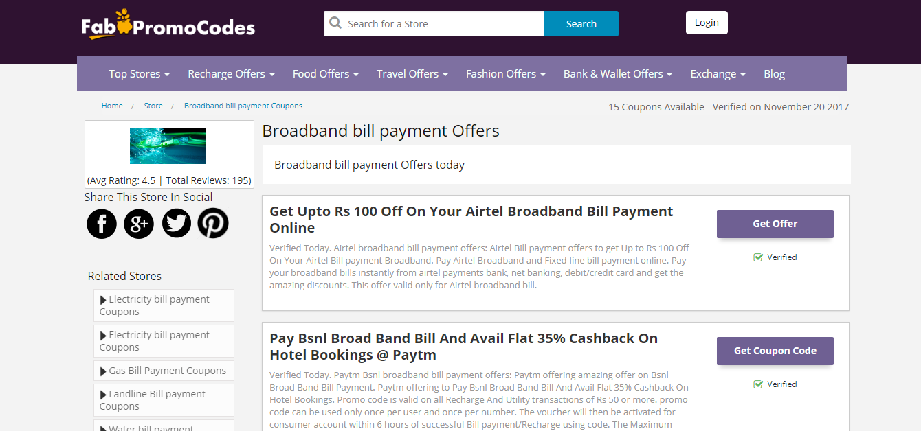 Visit Broadband Bill Payment and grab daily Coupons of Airtel, Act Fibernet, Tikona, Hathway, Spectranet, Bsnl etc. It has lots of coupons available for saving money on Broadband Bill payments. Checkout the best choice of yours a great discounts, deals and offers through Fabpromocodes Coupon Site.