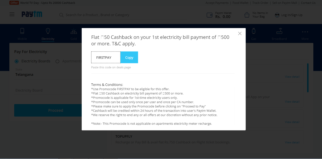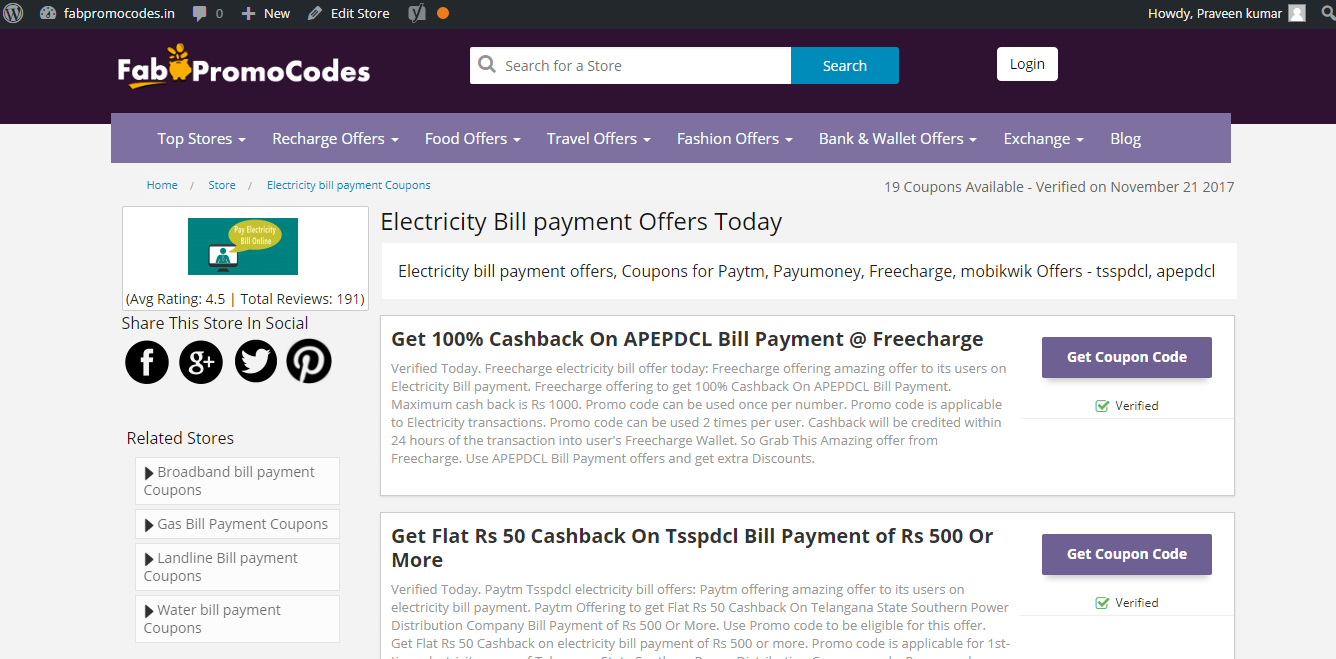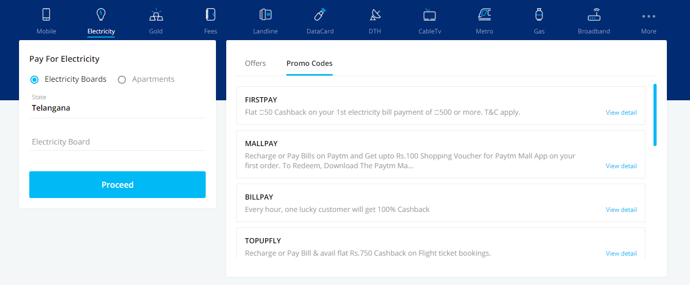 Visit Electricity Bill Payment and grab daily Coupons of APEPDCL, APSPDCL, APDCL, CSPDCL, TSNPDCL, TSSPDCL etc. It has lots of coupons available for saving money on Electricity Bill payments. Checkout the best choice of yours a great discounts, deals and offers through Fabpromocodes Coupon Site.