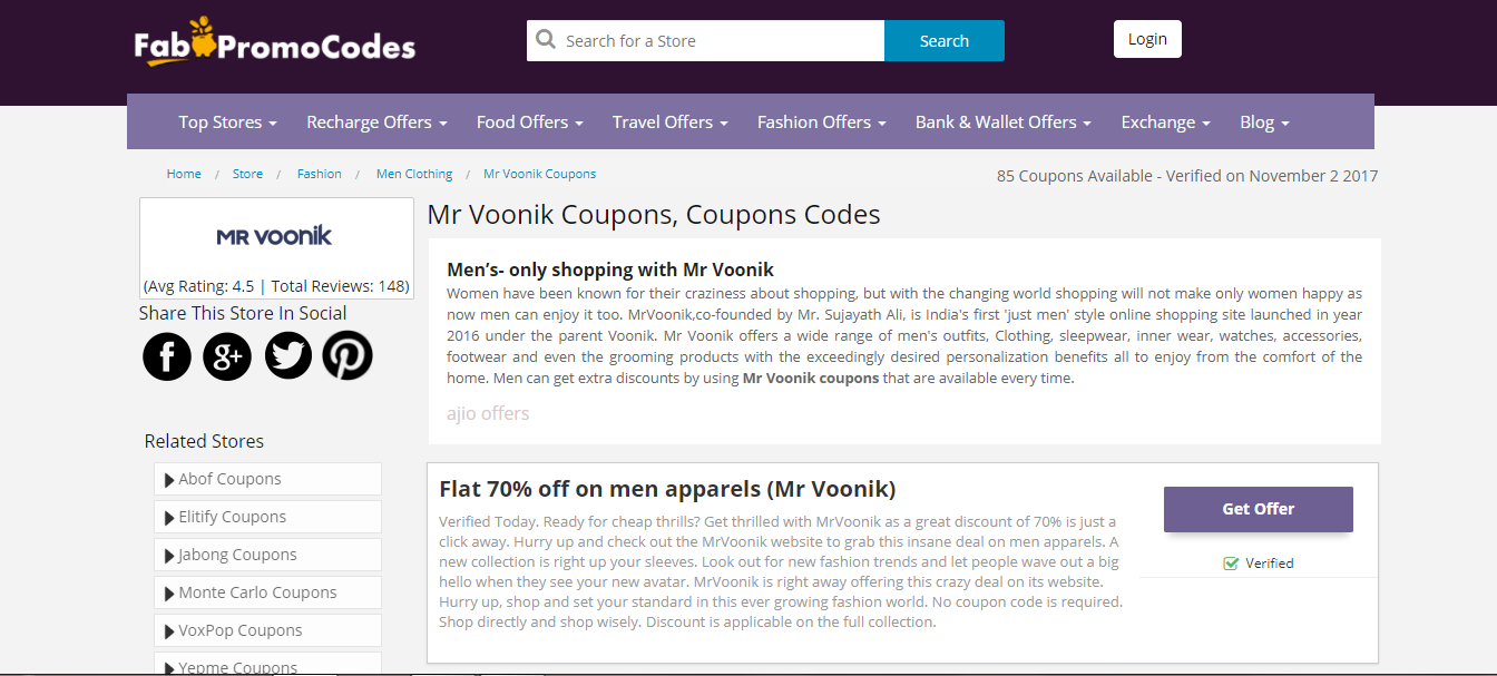 Visit Mr Voonik and grab daily Coupons of men fashion, accessories, latest fashion items etc. It has lots of coupons available for saving money on all brands. Checkout the best choice of yours a great discounts, deals and offers through Fabpromocodes Coupon Site.