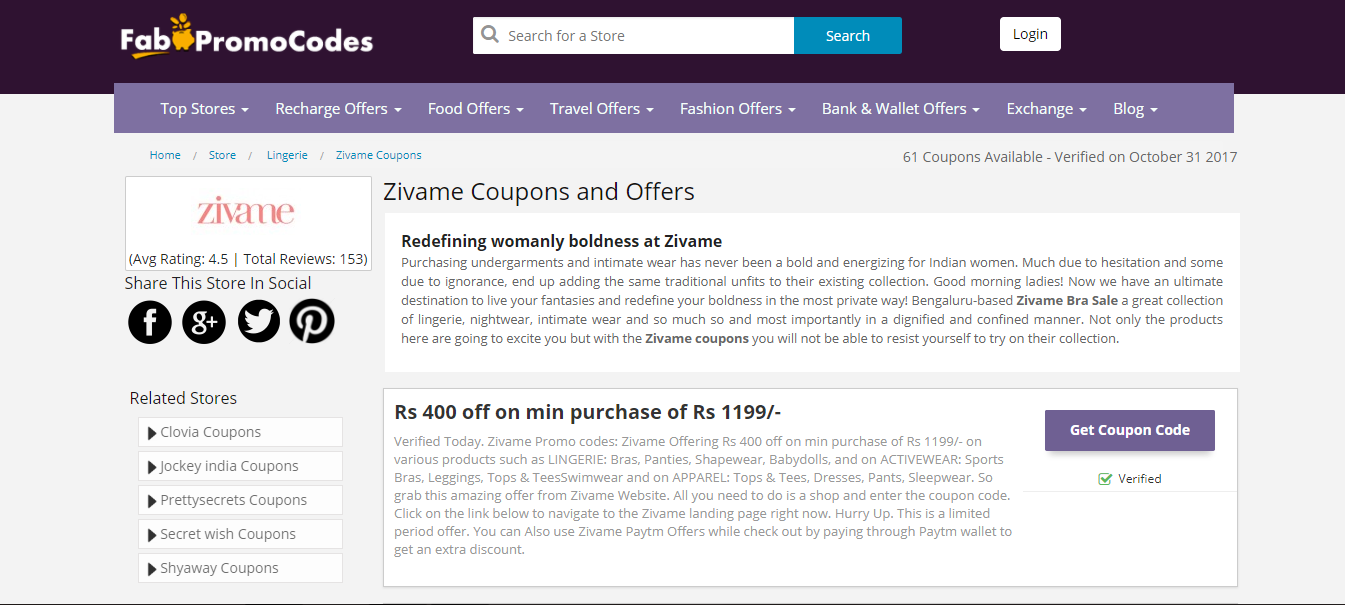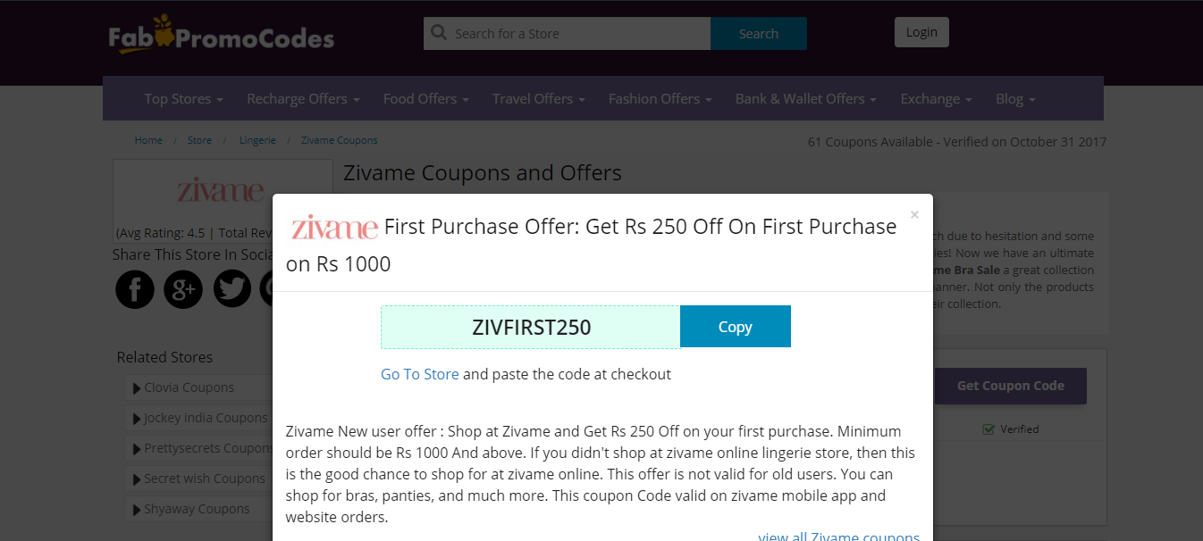 There are Many Stores listed out in Fabpromocodes, You can checkout by viewing all stores or you can search for Zivame in the search box