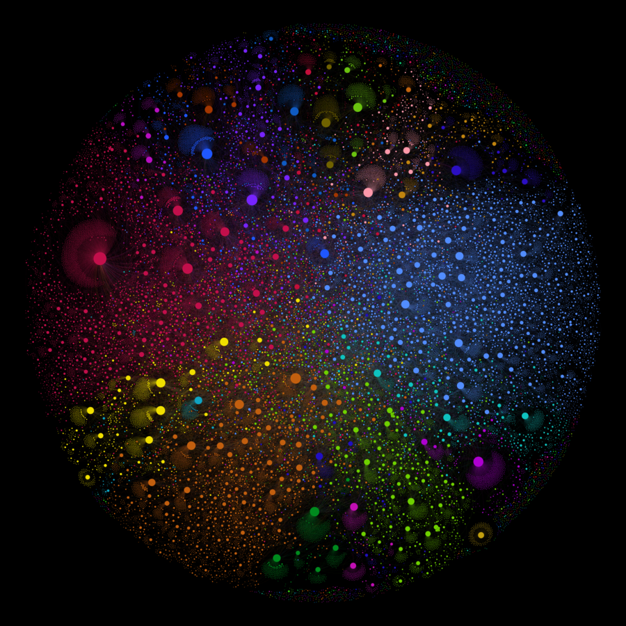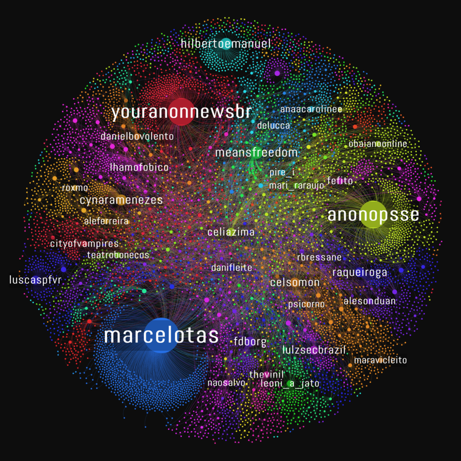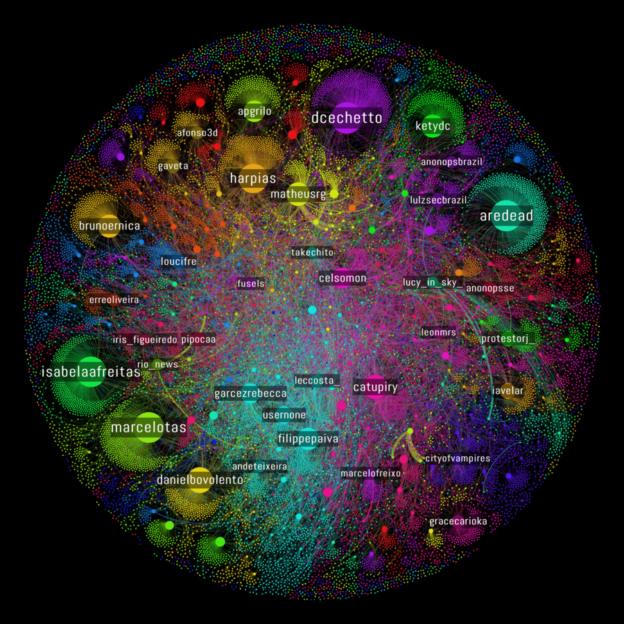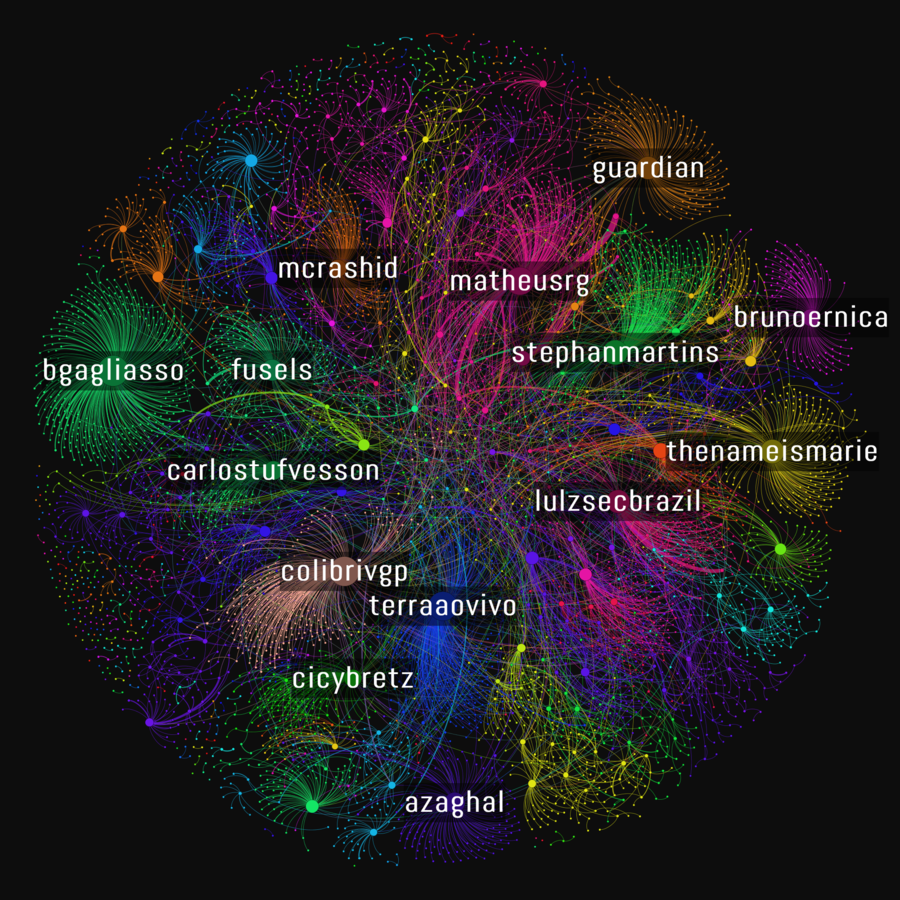 Observa-se muitas conexões efêmeras, que não se limitam a uma única clusterização responsável por dominar o discurso na rede, mas a várias que se fazem e desfazem a todo momento.
