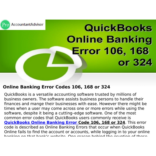 Are you facing <a href="https://www.proaccountantadvisor.com/quickbooks-online-banking-error-106-168-or-324/">QuickBooks Error 106, 168 or Error 324</a> in your online banking system? If yes then now you can settle these Errors by clicking the Reconnect my account link. That is displayed just after the error message. In this post we have given the solution for this error. Complying with the actions to choose your updated account with the financial institution.
