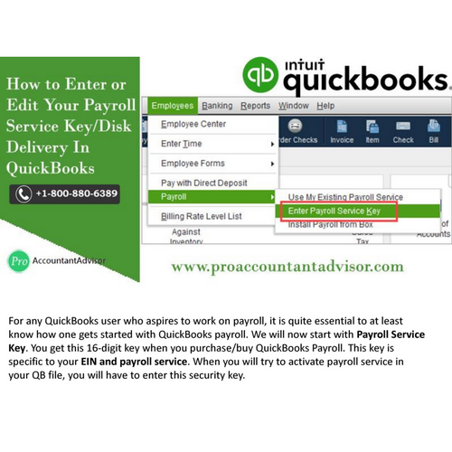 Whenever you purchase QuickBooks Payroll, you are offered a 16-digit service key that specifies to your EIN and payroll service. You have to enter this service key into QuickBooks to trigger the payroll service in your QuickBooks file. You have to comply with the offered steps in to this given post to <a href="https://www.proaccountantadvisor.com/enter-or-edit-your-payroll-service-key-in-quickbooks/">Enter or Edit Your Payroll Service Key</a>.