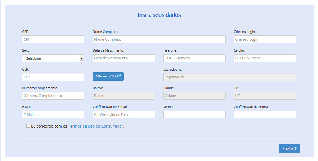 O cadastro do usuário para utilizar a plataforma é imprescindível, porém é bem fácil e simples de ser feito, devendo ser apenas preenchido o formulário a seguir: