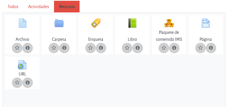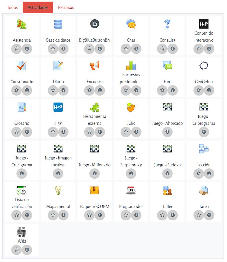Video, Tareas, Foro, Glosario, Páginas, Wikis