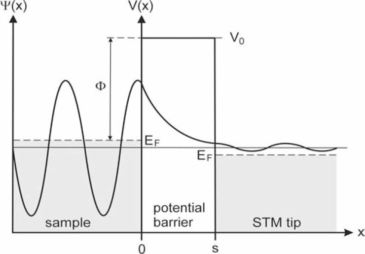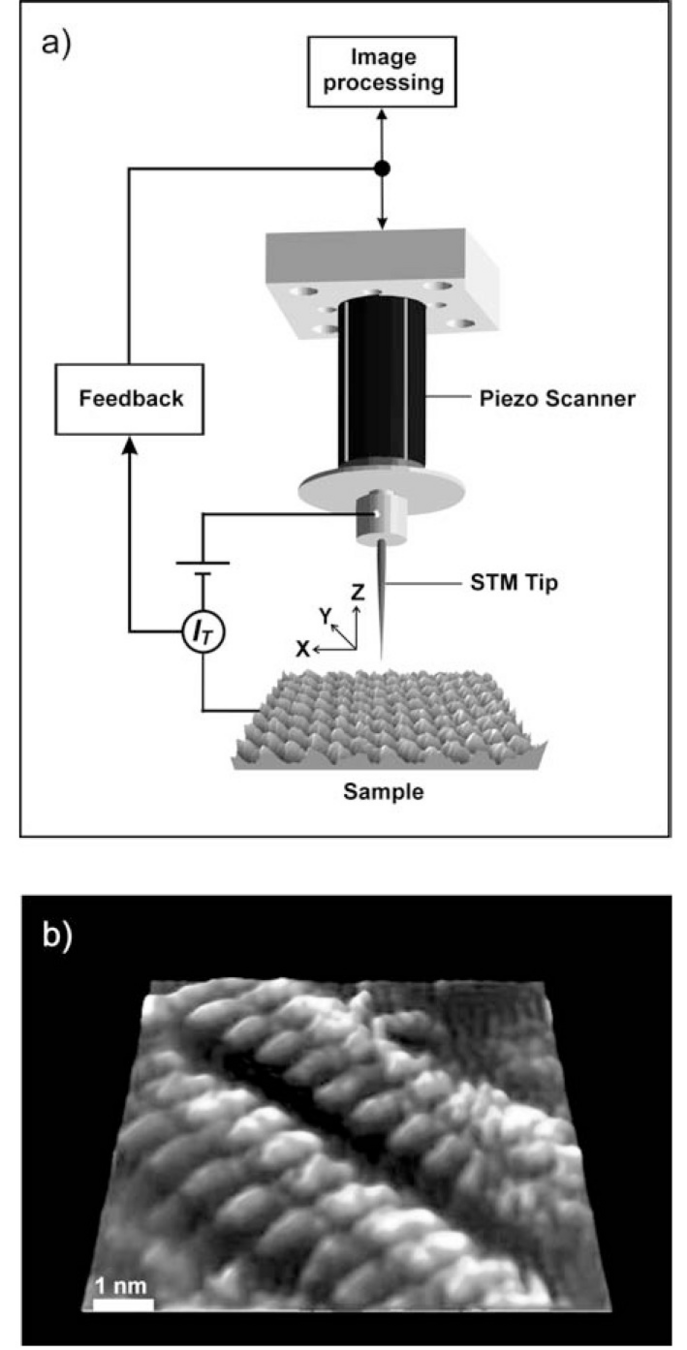 Electrons tunnel across an air gap into a nearby STM tip to image microscopic structure.