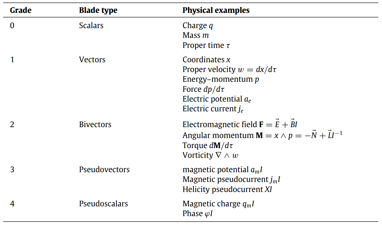 - Yields: (orthogonal) Clifford algebra \(\text{Cl}_{1,3}(\mathbb{R})\) ("Spacetime algebra")