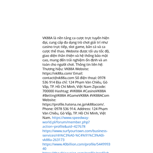 Website: https://profile.hatena.ne.jp/vk88acom/. VK88A là nền tảng ca cược trực tuyến hiện đại, cung cấp đa dạng trò chơi giải trí như casino trực tiếp, slot game, bắn cá và ca cược thể thao. Website được tối ưu tốc độ, giao diện thân thiện và hệ thố