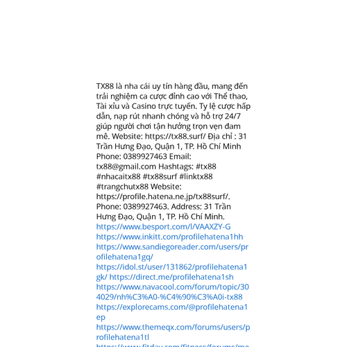 Website: https://profile.hatena.ne.jp/tx88surf/. TX88 là nha cái uy tín hàng đầu, mang đến trải nghiệm ca cược đỉnh cao với Thể thao, Tài xỉu và Casino trực tuyến. Ty lệ cược hấp dẫn, nạp rút nhanh chóng và hỗ trợ 24/7 giúp người chơi tận hưởng trọn