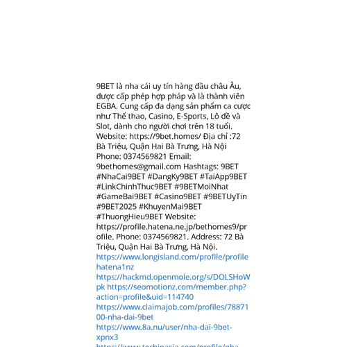 Website: https://profile.hatena.ne.jp/bethomes9/profile. 9BET là nha cái uy tín hàng đầu châu Âu, được cấp phép hợp pháp và là thành viên EGBA. Cung cấp đa dạng sản phẩm ca cược như Thể thao, Casino, E-Sports, Lô đề và Slot, dành cho người chơi trên