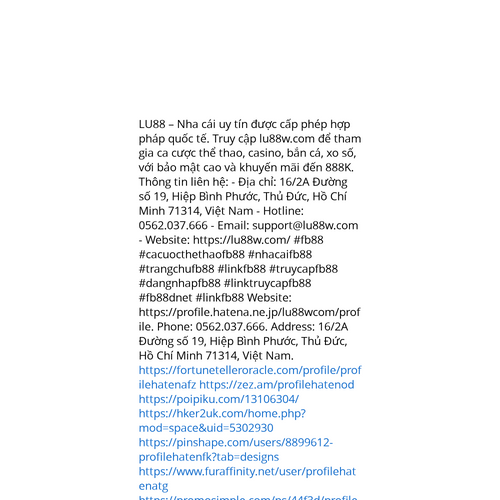 Website: https://profile.hatena.ne.jp/lu88wcom/profile. LU88 – Nha cái uy tín được cấp phép hợp pháp quốc tế. Truy cập lu88w.com để tham gia ca cược thể thao, casino, bắn cá, xo số, với bảo mật cao và khuyến mãi đến 888K. Thông tin liên hệ: - Địa ch