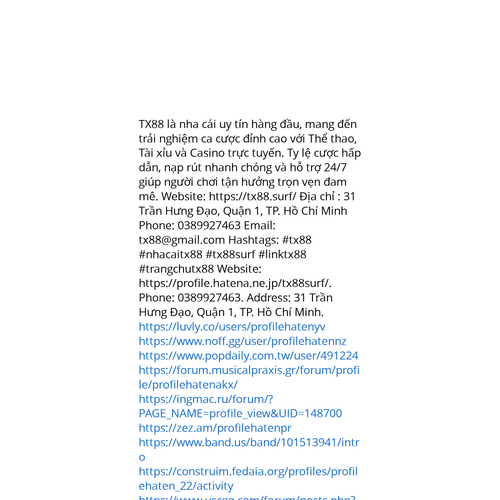Website: https://profile.hatena.ne.jp/tx88surf/. TX88 là nha cái uy tín hàng đầu, mang đến trải nghiệm ca cược đỉnh cao với Thể thao, Tài xỉu và Casino trực tuyến. Ty lệ cược hấp dẫn, nạp rút nhanh chóng và hỗ trợ 24/7 giúp người chơi tận hưởng trọn