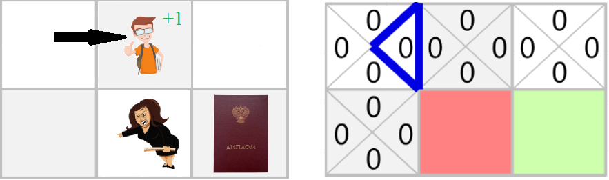 - Для агента 50% движение вправо и 50% движение вниз значение составляет 1,0 * 0,5 + 2,0 * 0,5 = 1,5;