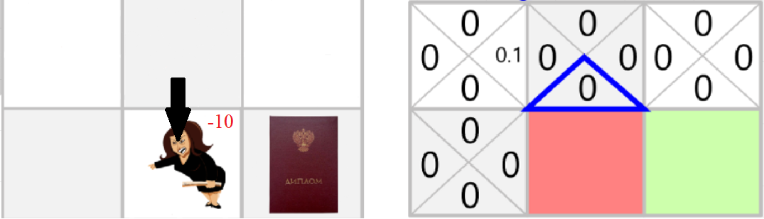 Q(Начальное состояние, вправо) = 0 + 0.1 * [-10 + 0.99 * 0 - 0]