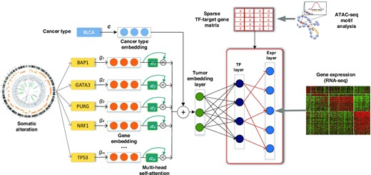 Overview of CITRUS: An attention-based model with TF-target gene priors. The input to our framework includes somatic alteration and copy number variation, assay for transposase-accessible chromatin with high-throughput sequencing (ATAC-seq), tumor expression datasets and TF recognition motifs. CITRUS takes somatic alteration and copy number variation data as input and encodes them as a tumor embedding using a self-attention mechanism. Cancer type embedding is used to stratify the confounding factor of tissue type. The middle layer further transforms the tumor embeddings into a TF layer, which represents the inferred activities of 320 TFs. Finally, gene expression levels are predicted from the TF activities through a TF-target gene priors constrained sparse layer based on ATAC-seq.